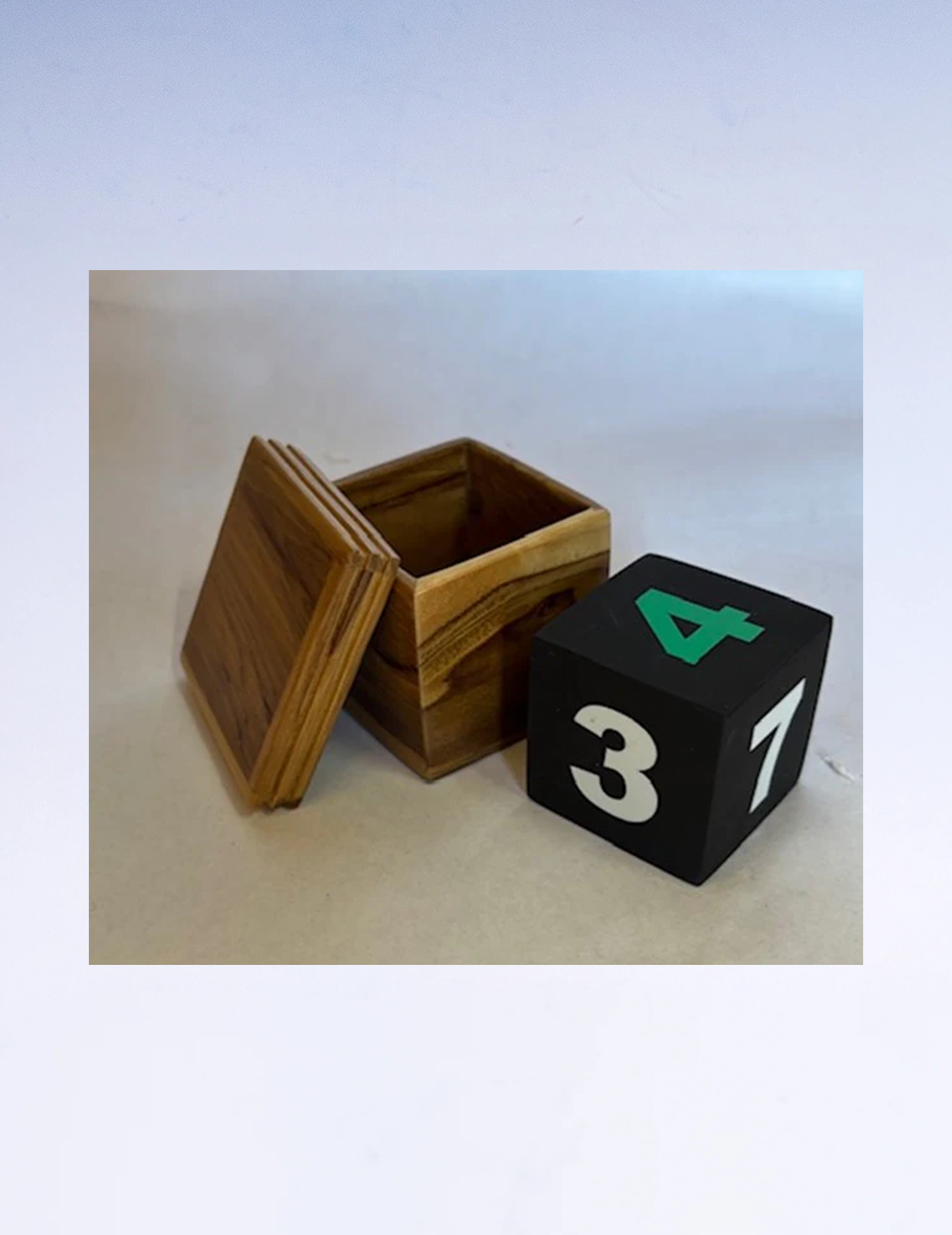 A spectator freely places a numbered cube into a beautifully crafted teakwood box and closes the lid. With a simple shake, the performer correctly reveals the hidden number. This can be repeated under increasingly fair conditions. For the final phase, the spectator takes full control - holding the cube and box behind their back, rotating the cube freely, then sealing it inside the box themselves.